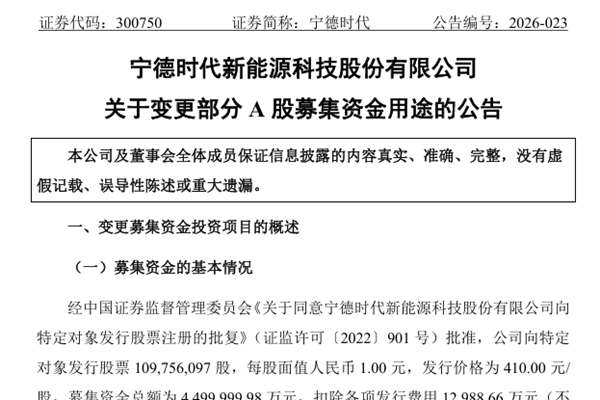宁德时代拟变更48亿元募资用途 投建厦门电池产业基地项目