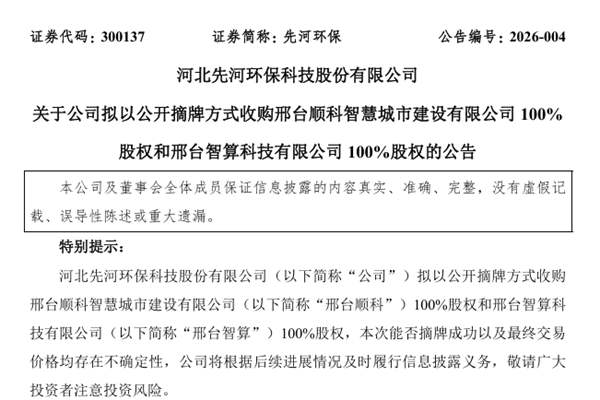4.8亿!先河环保拟收购邢台顺科和邢台智算100%股权