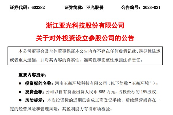 亚光股份拟855万元参与设立玉衡环境,拓展CCUS、污水处理等业务