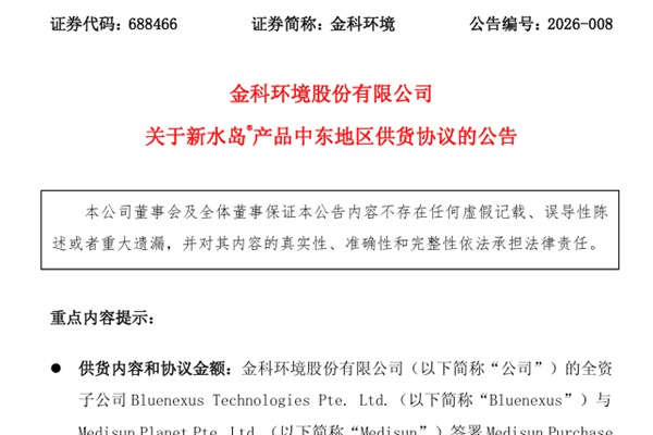 金科环境:签署产品中东地区供货协议 金额为1510万美元