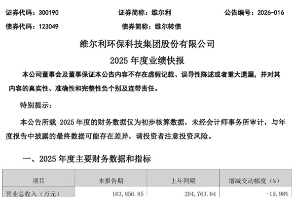 维尔利:2025年净利润-3.48亿元,同比减亏