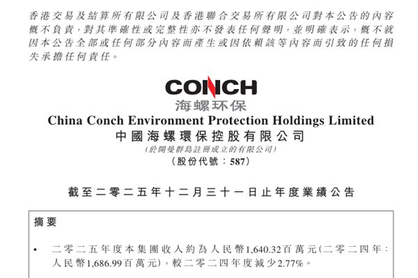 海螺环保:2025年权益股东应占亏损2.28亿元,同比由盈转亏