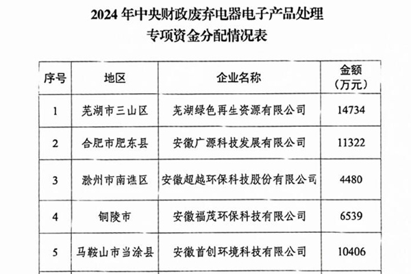 54446万元,安徽下达2024年废弃电器电子产品处理专项资金预算