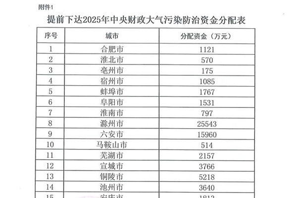 65884万元,安徽提前下达2025年中央财政大气污染防治资金