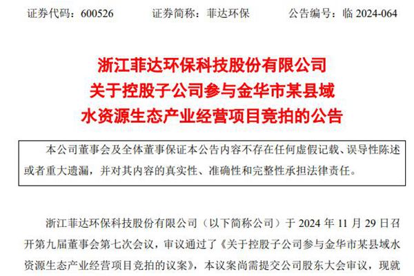 菲达环保:子公司拟不超17亿元竞拍水资源生态产业经营项目