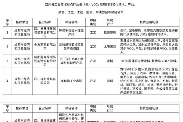 四川省工业领域重点行业低(无)VOCs原辅材料替代技术、产品、装备、工艺、工程、案例、解决方案等项目名单公布