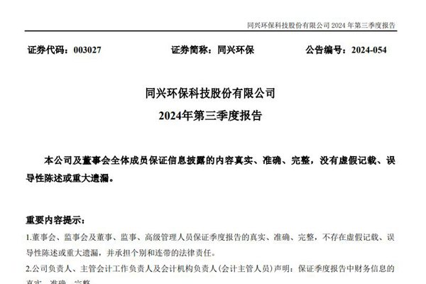 同兴环保:前三季度营收约4.06亿元,同比减少23...