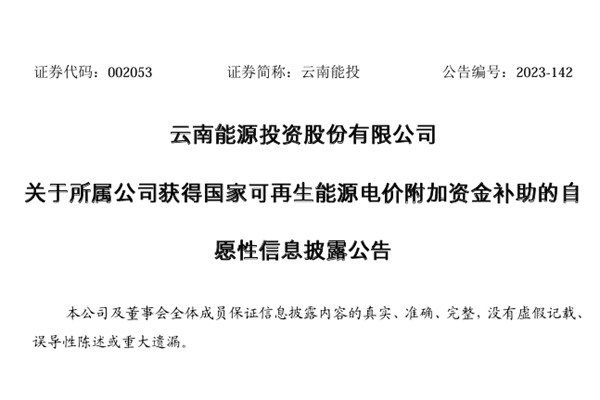 云南能投获国家可再生能源电价附加资金补助2770万元