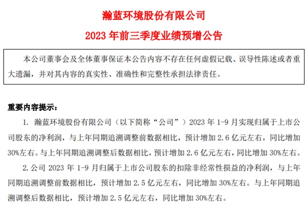 瀚蓝环境2023年前3季度业绩预增2.6亿元,同比增加30%!