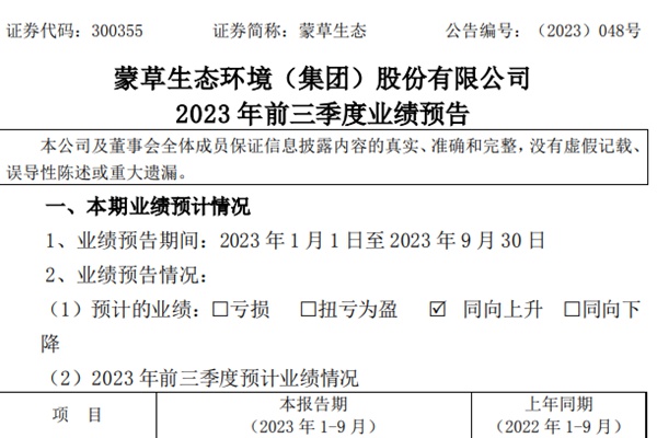 蒙草生态2023年第三季度净利润预计增长超135000%!