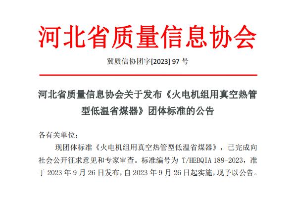 河北省质量信息协会发布《火电机组用真空热管型低温省煤器》团体标准