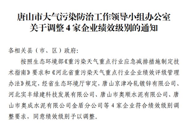 唐山市大气污染防治工作领导小组办公室通知调整4家企业绩效级别!
