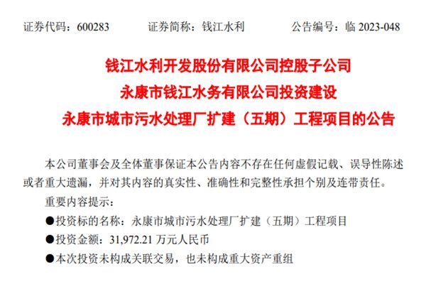 钱江水利:子公司拟投资3.2亿元扩建永康市城市污水处理厂