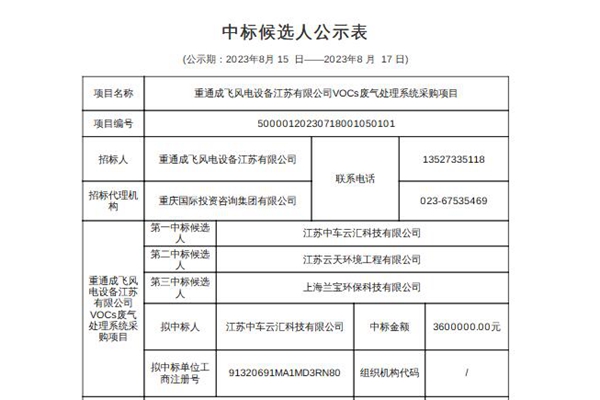 重通成飞风电设备江苏公司VOCs废气处理系统采购项目公示中标候选人