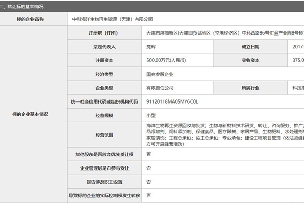中科海洋生物再生资源(天津)有限公司20%股权挂牌...