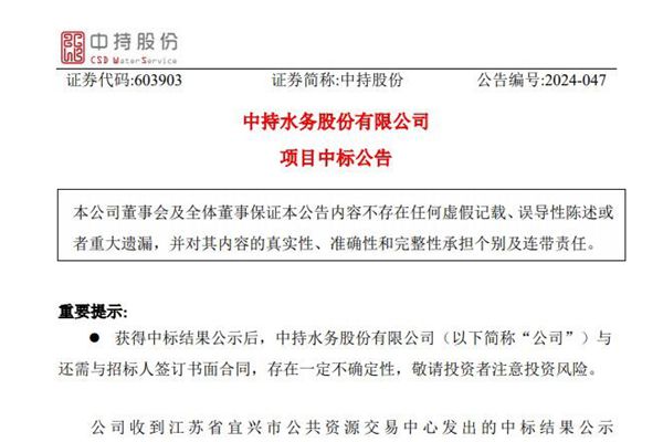 中持股份中标宜兴新概念工业污水处理厂设备采购项目