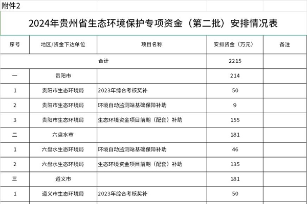 贵州下达2024年生态环境保护专项资金(第二批)预算 合计2215万元