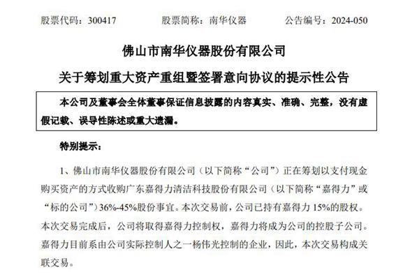 拓展智能化清洁设备业务,南华仪器计划现金收购嘉得力36%-45%股份