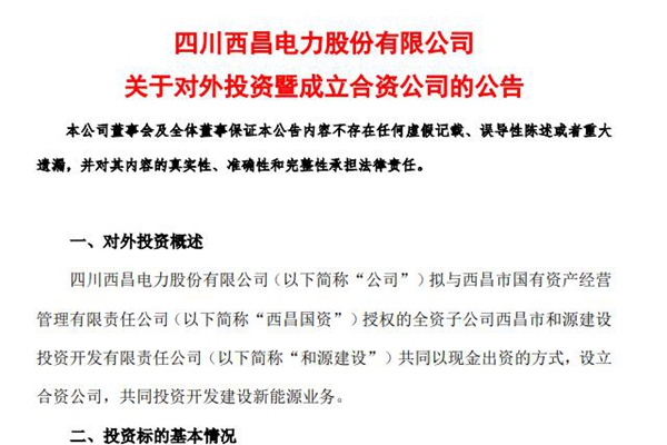 西昌电力:拟设立合资公司,共同投资开发建设新能源业务