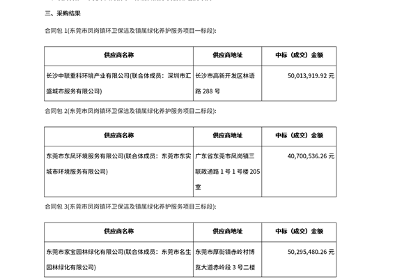 1.4亿东莞市凤岗镇环卫保洁及镇属绿化养护服务项目3个标段分属3个联合体