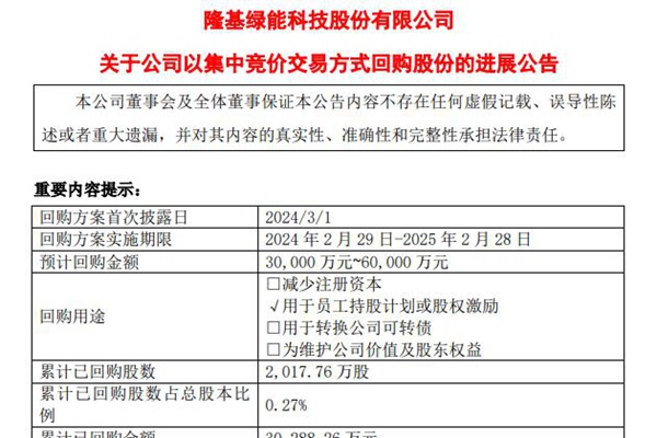 隆基绿能:已回购2,017.76 万股,金额3亿+