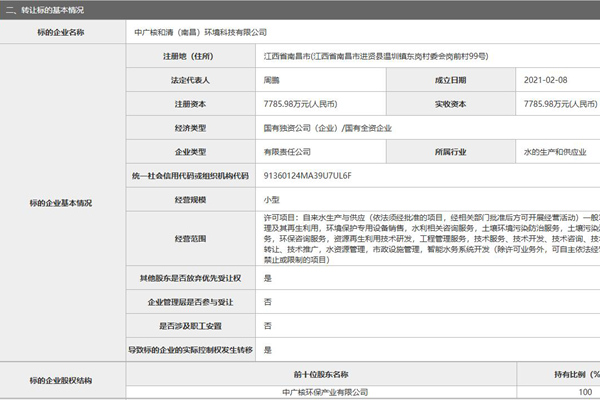 中广核和清(南昌)环境科技有限公司100%股权转让,底价7700万