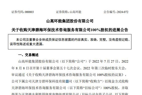 山高环能下属公司收购天津碧海环保100%股权有新进展