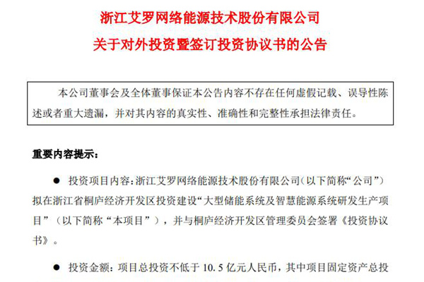 不低于10.5亿 艾罗能源拟在浙江桐庐投资建设“大型储能系统及智慧能源系统研发生产项目”