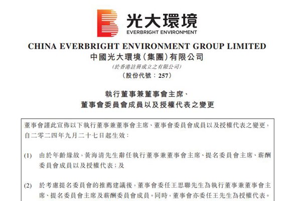 光大环境“换帅”,委任王思联为执行董事兼董事会主席