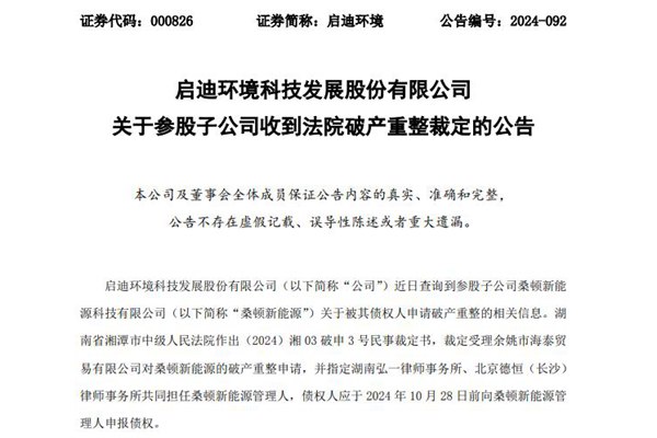 启迪环境参股,湖南锂电大企业破产重整