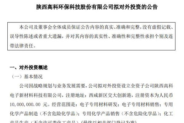 注册资本1000万,高科环保拟设立电子新材料公司