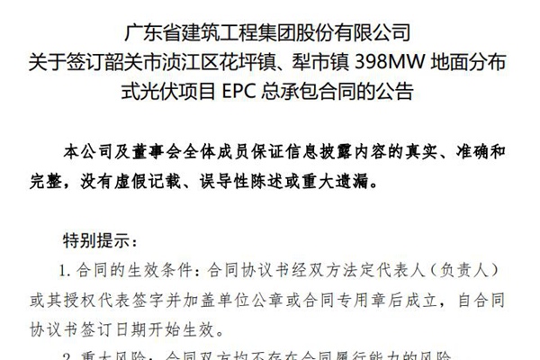 广东建工:韶关分布式光伏项目已签订20个子项目EPC总承包合同