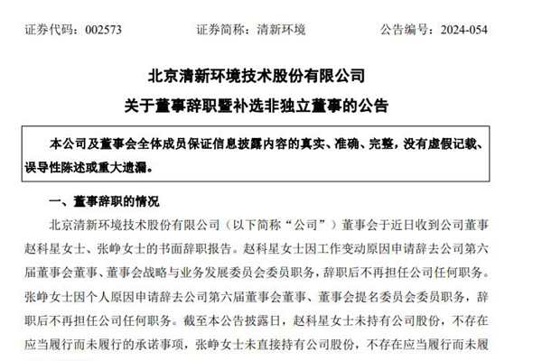 清新环境董事辞职