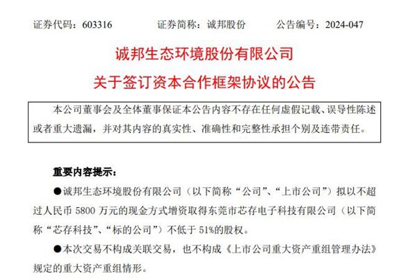 诚邦生态环境:拟以不超过5800万元增资取得芯存科技51%股权