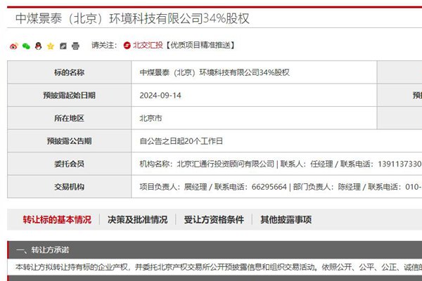 中煤矿业集团拟转让旗下环保科技公司34%股权