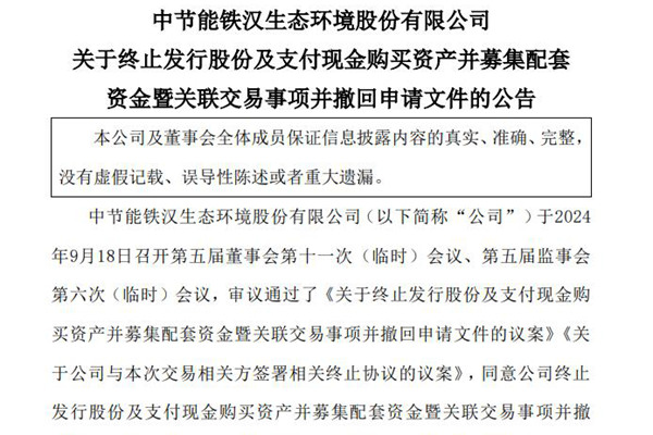 节能铁汉发布公告,终止中节能大地以及普捷环保股权收购