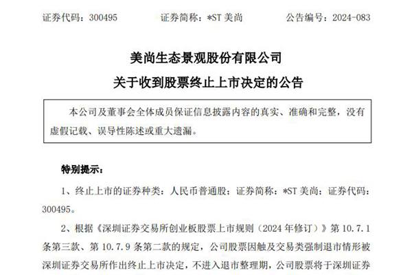 收到终止上市决定!美尚生态将于十五个交易日内摘牌
