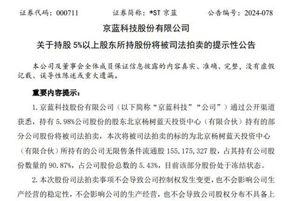 京蓝科技股东持有的5.43%股权将被司法拍卖...