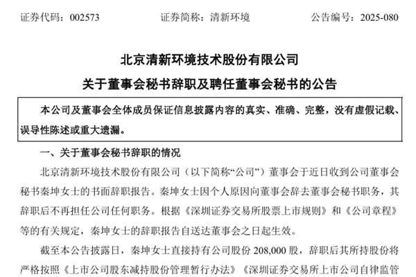 清新环境董事会秘书变更