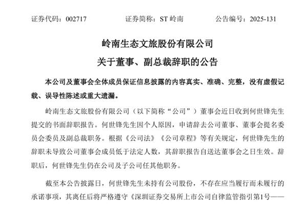 岭南股份董事、副总裁辞职
