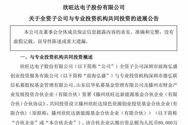 欣旺达:滕州欣旺达绿色资源创业投资基金合伙企业(有限合伙)完成备案 缴付首期1400万