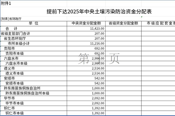 11423万元,贵州财政厅提前下达2025年中央土壤污染防治资金预算