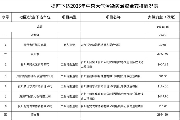 14916.45万元,贵州省财政厅提前下达2025年中央大气污染防治资金预算