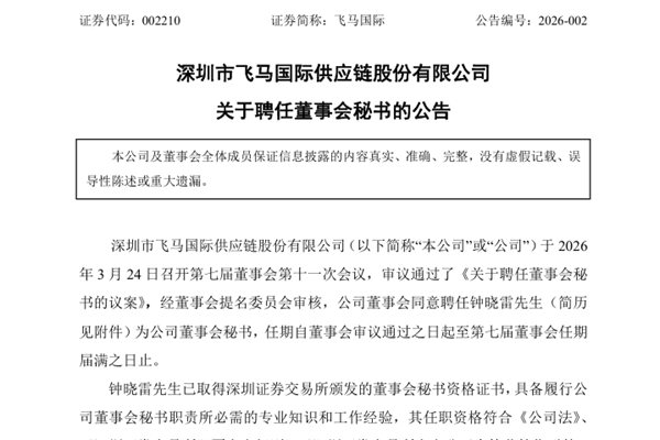 飞马国际聘任钟晓雷为董事会秘书
