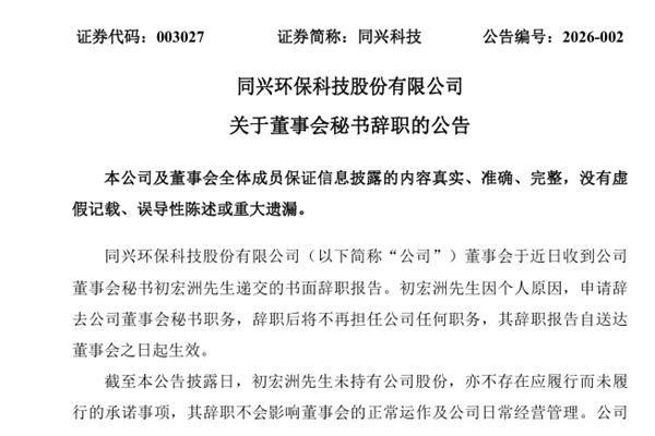 同兴科技董事会秘书辞职