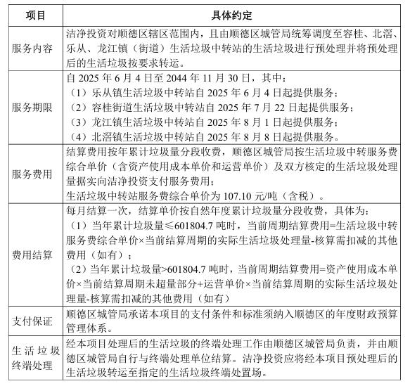 据介绍,洁净投资拥有佛山市顺德区容桂、北滘、乐从、龙江镇(街道)的生活垃圾中转站资产,并与佛山市顺德区城市管理和综合执法局(简称“顺德区城管局”)签署《顺德区生活垃圾中转服务合同书》,为容桂、北滘、乐从、龙江镇(街道)提供生活垃圾中转服务以收取服务费。主要内容包括: